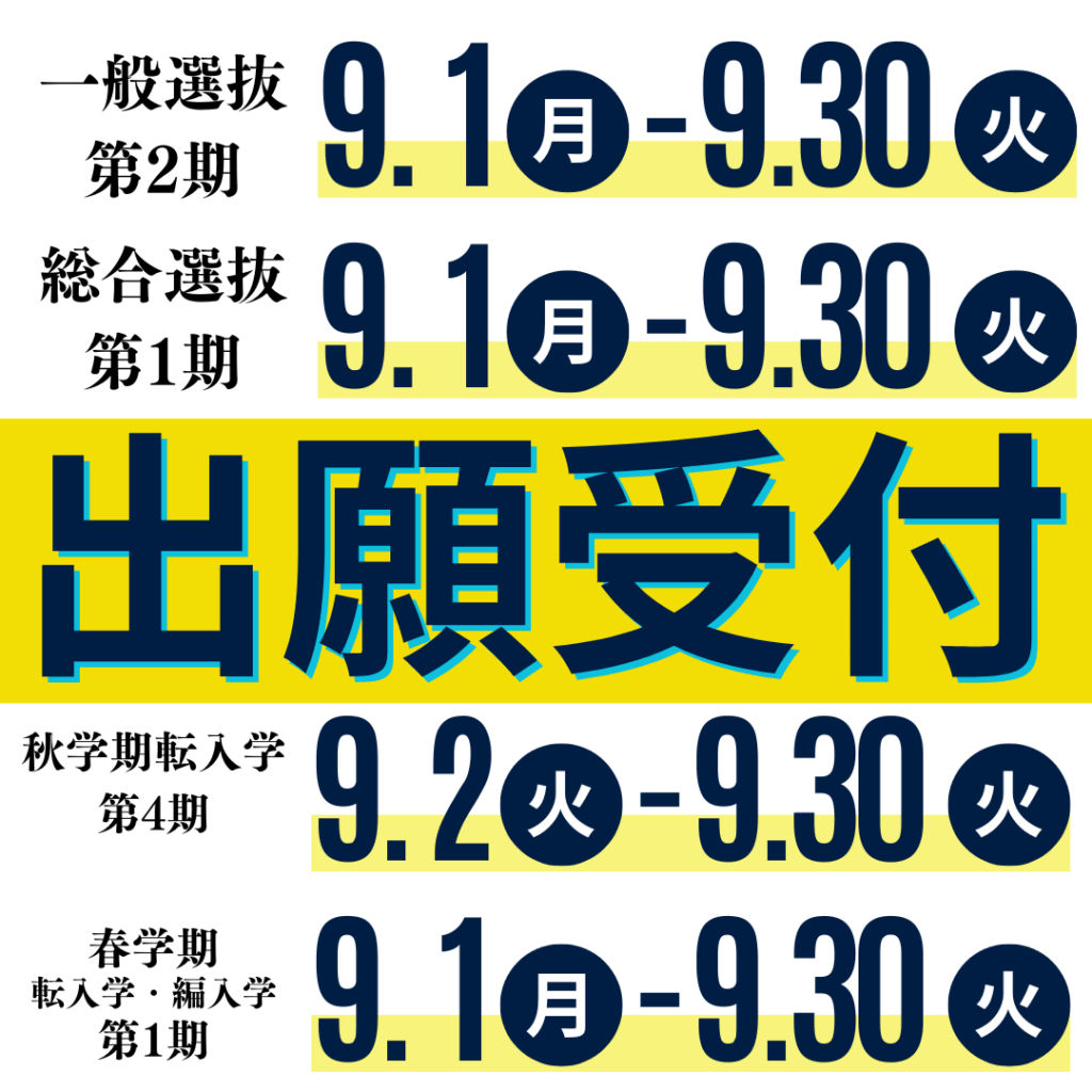 入学金が免除になる【早期出願特典制度】の申込の対象は一般選抜、総合選抜、2026年度転入学・編入学です。