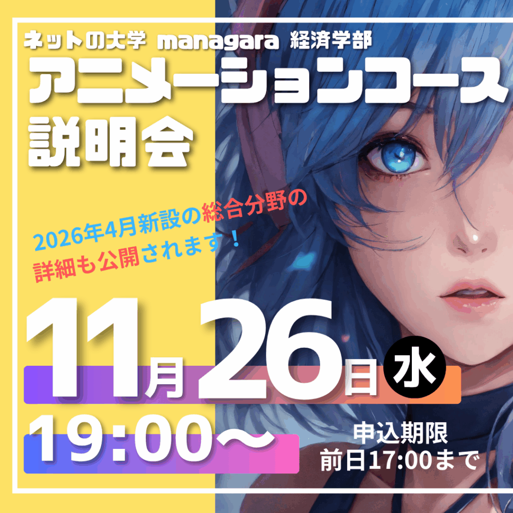 経済学部で人気の「アニメーションコース」の説明会が11月26日(水)19:00~ Zoomにて開催決定!「アニメやエンタメが好きだけど、将来の仕事はまだ決められない…」という人におすすめです!
