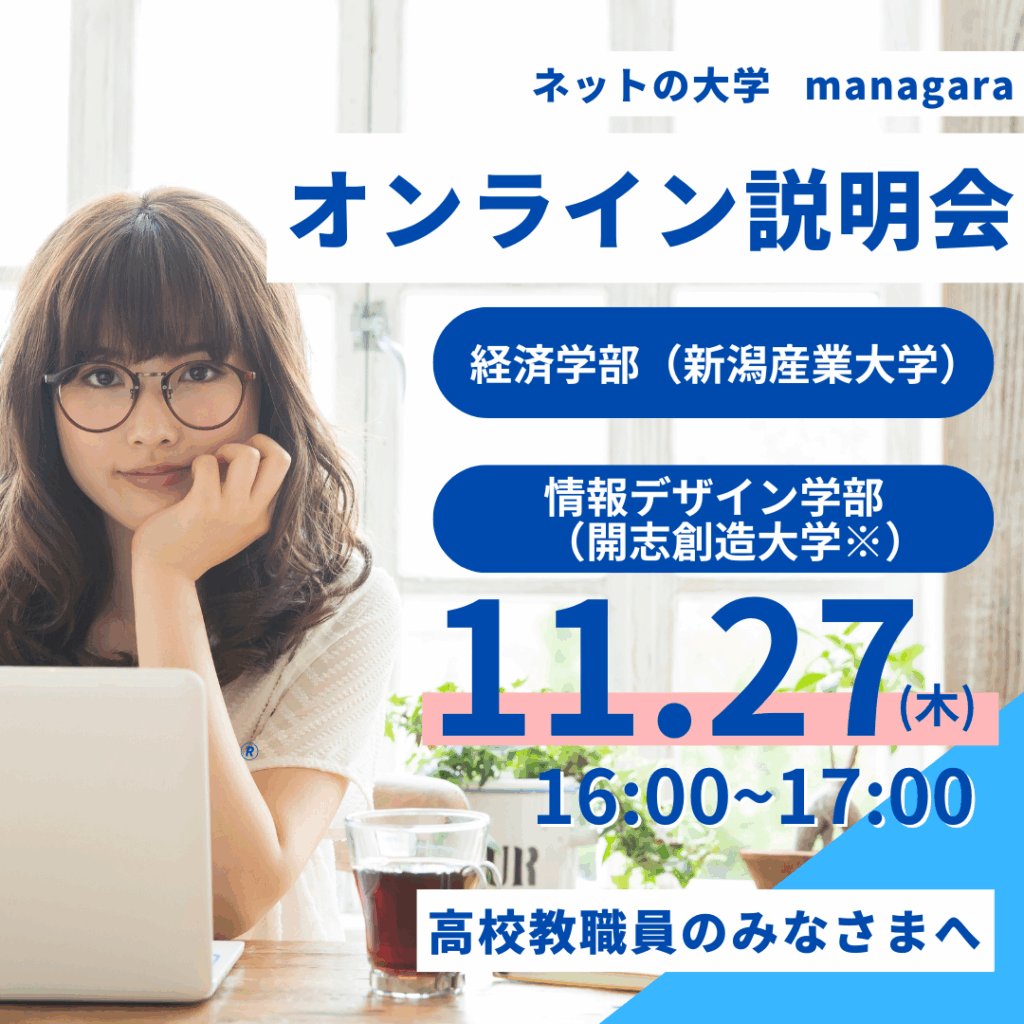 このたび、「ネットの大学 managara」では、進路指導のご参考にしていただくため、高校教職員のみなさまへ向けたオンライン説明会を11月27日(木)に開催いたします 。