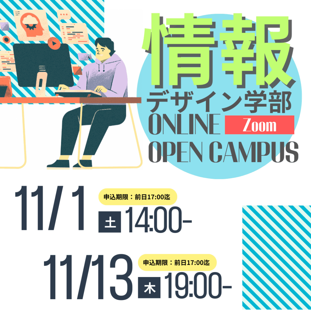 以下のとおり、情報デザイン学部(開志創造大学※)は、11月にオープンキャンパスを実施いたします。オープンキャンパスでは、「ネットの大学 managara」での大学生活をオンライン上で体感できる機会です。是非遊びに来てくださいね!