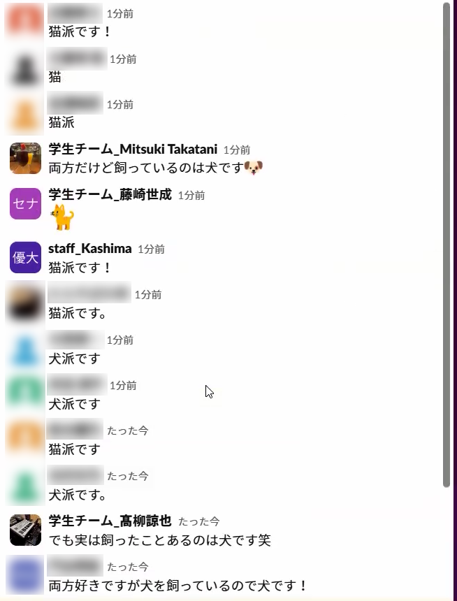 学生から「犬派ですか?猫派ですか?」と質問リクエストがあり、お互いの良いところを議論したりと、楽しいながらも有意義な時間となったようです。