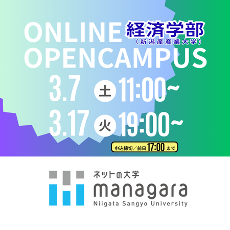 以下のとおり、経済学部(新潟産業大学)は、3月にオープンキャンパスを開催いたします。