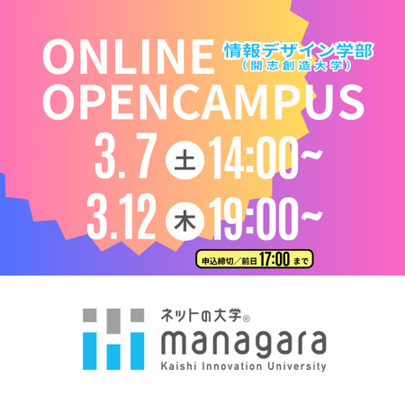 以下のとおり、情報デザイン学部(開志創造大学※)は、3月にオープンキャンパスを実施いたします。オープンキャンパスでは、「ネットの大学 managara」での大学生活をオンライン上で体感できる機会です。是非遊びに来てくださいね!