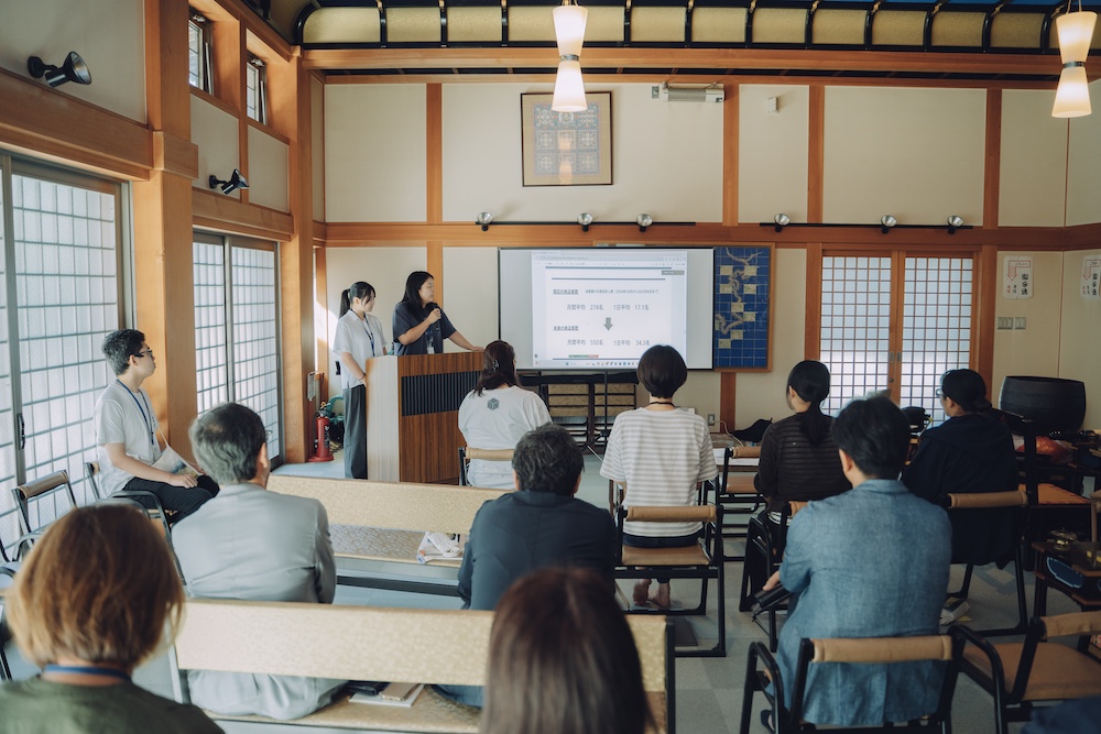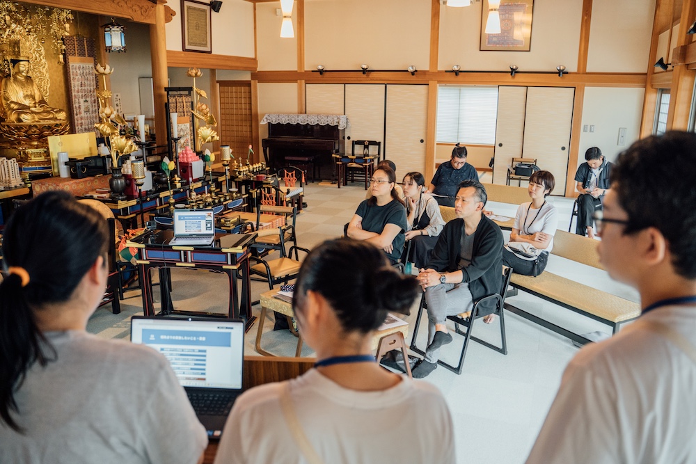 岩本寺のお堂に集まり、事業者さんが抱える課題に対し、仲間と考えた新しい価値やアイデアを提案。事業者さんの意見を聞きながら、最終プレゼンに向けて指標を立てます!