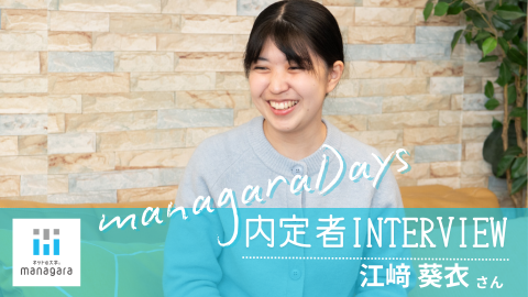 内定者interview第二回は、経済学部 ベーシックコース4年生の江﨑葵衣さん。江﨑さんの場合、3年次に総務省が実施する「地域おこし協力隊制度」に応募し、「一般財団法人たらぎまちづくり推進機構」の隊員として2025年6月から従事。managaraでの学びを深めながら地域課題と向き合い、様々な取り組みを行っています。この取材を進めていくと、企業で務める以外にも自分らしさを大切にした働き方もあること、信念を掲げ、前に進む江﨑さんの魅力を感じられました。今回は、卒業を控えた江﨑さんにmanagaraでの就職活動(以下、就活)の様子や就職に対する意識の持ち方、今後の展望などお話を伺いました。