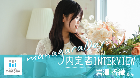 今回は「内定者INTERVIEW」と題し、2024年1月にmanagaraDaysで取材した岩澤香織さんをピックアップ。managaraDays特別編としてお送りいたします。岩澤さんは、サービス事業を展開する大手企業のグループ会社で、事務職として内定が決まりました。以前の取材からの成長や心境の変化も交え、入学から内定、そしてmanagaraで学んだことを就職先でどう活かしたいかなど、将来への展望を伺いました。