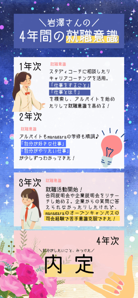 合同説明会や企業説明会に参加するために、managaraの学修時間やアルバイトを調整してスケジュールを立てていましたが、このキャリアコーチングでの相談やスタディコーチに相談したりして、私がしたいことや合う職業を可視化できたと思います。社会人経験がなく、「社会人になったらどんな生活をするのか」などまったく想像できなくて、キャリアコーチングを利用してアドバイスをもらったりしていました。アドバイスをもらうことで自分の中で「こういう仕事をしてみたい」「こんな仕事は合うかな?」と指標を定めるきっかけにもなり、今回、ご縁があって企業様より内定をいただきました。